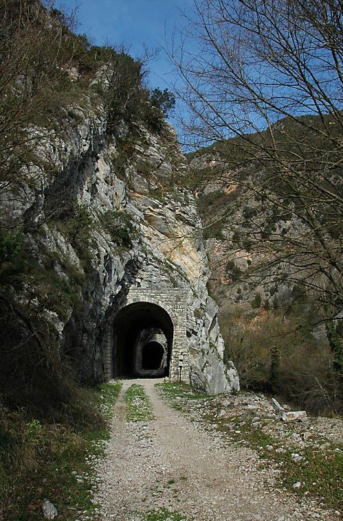 La salita continua, fino ad arrivare alla galleria di valico della Caprareccia, lunga 1.936 metri. Percorrerla è una esperienza spettacolare, si capisce cosa provavano i minatori che l’hanno scavata, la galleria è buia, quando si è dentro non si vedono ne l’ingresso ne l’uscita, esattamente come quando fu scavata.