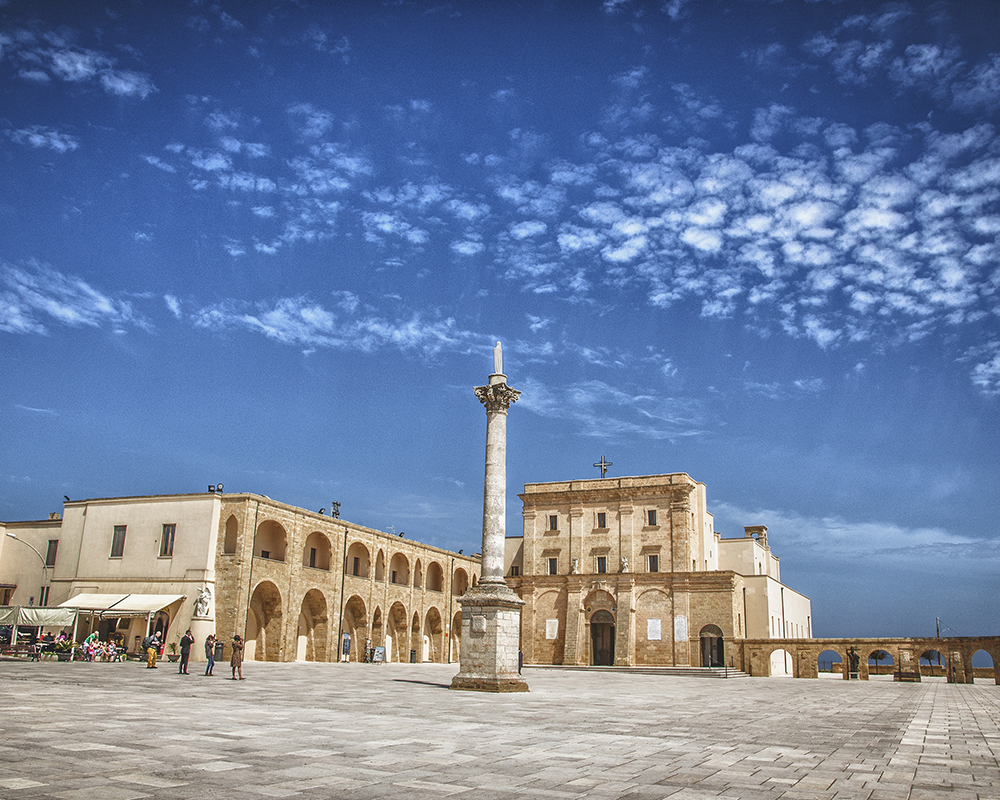 Il mar Ionio e l’Adriatico si abbracciano a Santa Maria di Leuca, e il suo Faro alto 47 metri, si erge su Punta Meliso, a dominare la baia su cui sorge il borgo. Ai piedi del faro, c’è la Basilica di Santa Maria de Finibus Terrae, luogo di devozione a picco sul mare, e qui vicino termina l’Acquedotto Pugliese con una cascata monumentale.