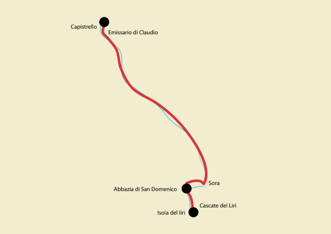 Una volta scesi dal treno e sistemata la bici, questo percorso consente di visitare i luoghi in cui l’emissario di Claudio si immette nel Liri con un’imponente cascata e riporta nella media Valle del Liri con una piacevole pedalata.