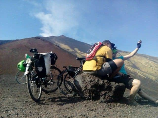 Divorare in pochi secondi quei metri conquistati tanto faticosamente ti dà un’idea dell’energia potenziale accumulata. E del fatto che tutto è relativo. La lunghezza della discesa riscalda i cerchi e fonde le camere d’aria: Piero fora due volte per questo motivo e solo a fatica riusciamo a guadagnare il nostro campo base, comprando altre camere d’aria a Giarre e ritornando nel buio alle tende. L’impresa di oggi va celebrata, e una cenetta a base di pesce e vino bianco a bordo mare è doverosa. Gli effetti sono devastanti: la stanchezza avvolge tutti, e questa terza e ultima notte ci sorprende in uno stato pietoso. Piero si addormenta in tenda da seduto, coi panni da lavare ancora in mano.