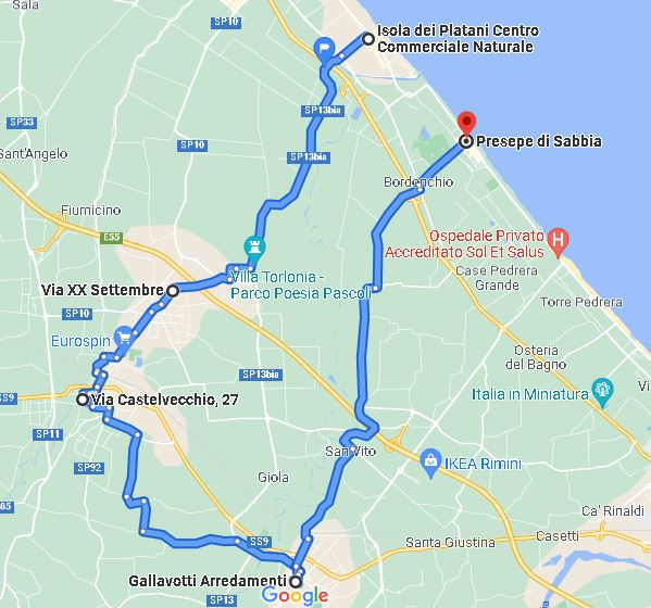 Per raggiungere la tappa successiva del tour, ci si sposterà nello splendido borgo di Santarcangelo di Romagna. Procedendo in direzione sud su via Castelvecchio svoltare alla rotonda su viale della Libertà. Alla rotonda successiva si prende la prima uscita su via Don Minzoni, successivamente si imbocca poi via Verdi sulla sinistra, procedendo per 290 m svoltando infine a destra su via Della Pace/SP 92. Successivamente si attraversa la rotonda e si gira a sinistra su via della Pietà proseguendo poi fino alla svolta a destra in via S. Bartolo rurale. Continuando per oltre 1 km, si imbocca via Paglierani e dopo 400 m si gira a destra in via Giovannone. Giunti al termine della strada, a sinistra, si prende via S. Bartolo Comunale seguendola per 1,7 km. Svoltando a destra si giunge poi su via A. Costa che prosegue come via Marini, dopo 1,3 km svoltare alla prima a destra, in via Matteotti e successivamente a sinistra ovvero via Minzoni. Si arriva così in via Lauro de Bosis 4, dove è sito Palazzo Gallavotti, sede dell’allestimento presepiale di Santarcangelo di Romagna.