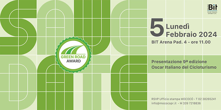Tra gli eventi da non mancare lunedì 5 febbraio alle ore 11,00 alla BIT Arena al padiglione 4 la presentazione della nona edizione dell’oscar italiano del cicloturismo “Green Road Award”.