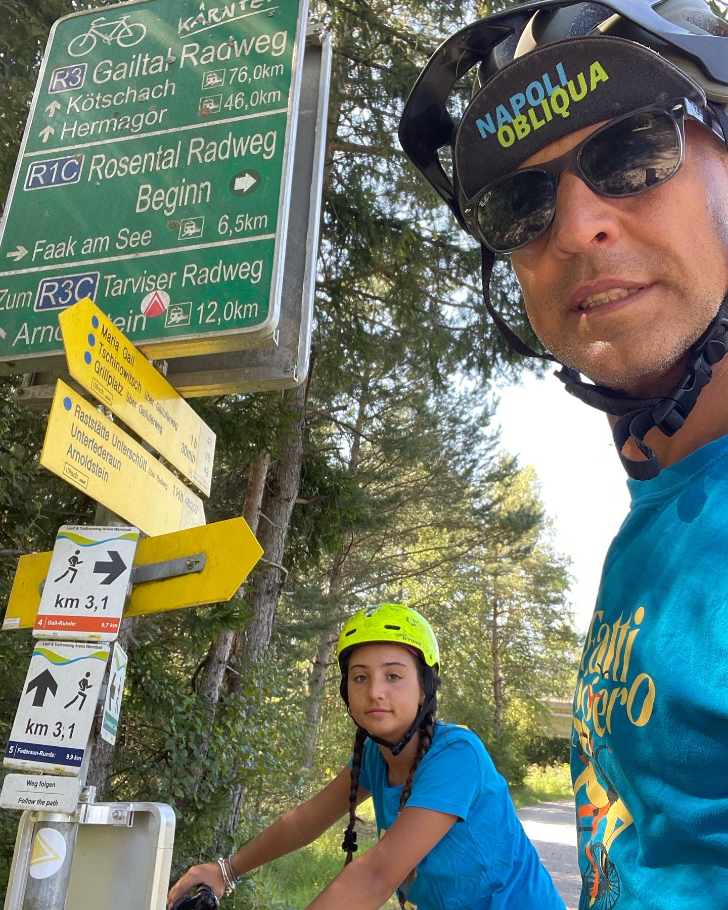 I tappa – Partiamo da Verona la mattina presto e con tre cambi treno siamo a Dobbiaco in primissimo pomeriggio. Scarichiamo le bici e si parte, la ciclovia corre in una vallata circondata dalle Alpi, tra cui quelle più famose delle tre cime di Lavaredo. La ciclabile è favolosa. Semplice. Una striscia di asfalto, senza alcuna segnaletica orizzontale a totale disposizione di chi pedala. La segnaletica è funzionale, basta prendere la direzione giusta ed andare. Dopo i primi km, Gaia mi ha fatto subito notare perché non l’avessi mai portata nei dintorni di Napoli in un posto del genere.