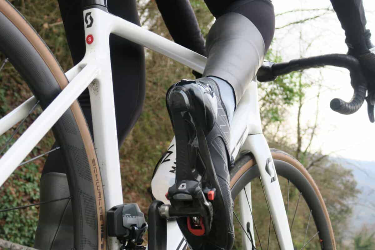 È la principale interfaccia che trasmette la forza espressa dai muscoli con il mezzo meccanico, deve essere ergonomicamente modellata in base alle caratteristiche anatomiche del piede e strutturalmente concepita per aderire al meglio al pedale; deve ottimizzare la forza di spinta e allo stesso tempo deve essere comoda, soffice ai piedi. Lo avrete capito, stiamo parlando della scarpa da ciclismo.