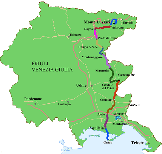 Si parte dal Santuario di Barbana e si va fino alla Basilica di Santa Maria Assunta ad Aquileia, passando per il Santuario della Beata Vergine di Castelmonte fino al Santuario del Monte Lussari. Un viaggio in bici attraverso tutto il Friuli. Da Barbana a Grado ci si sposta in vaporetto. Poi il percorso è così scandito: Grado – Cormons (51 km) – Cividale del Friuli (35 km) – Monte Maggiore (39 km) – Alta Val del Torre (28 km) – Dogna (43 km) – Sella Sampodogna (18 km) – Monte Santo dei Lussari (15 km) – discesa a Tarvisio (12 km). In totale sono 241 chilometri per un dislivello di 6375 metri.