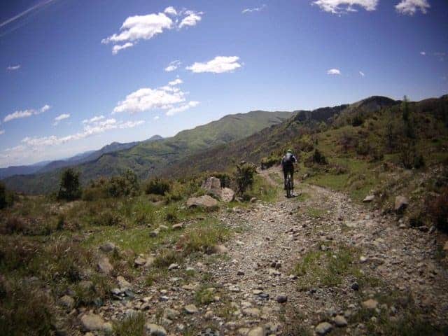 Il primo tratto scorre via liscio, nel senso che lo percorriamo sull’asfalto della provinciale che porta al Passo del Bocco. Ma dopo pochi chilometri svoltiamo a sinistra su una stradina la cui insegna indica Casale. La salita è davvero decisa, anche se ancora asfaltata, ma per poco. In pochi tornanti la strada è un ricordo che lascia posto ad uno sterrato largo e con una buona pendenza. Il cielo è blu punteggiato da nuvole di tutti i colori e appare a scompare a intermittenza, da un bosco di faggi in cui la nostra (mia) lentissima ascesa si infila decisa. Io mi sforzo di non scendere ad ogni sasso più grosso, a ogni buca. La velocità si abbassa fino a sfidare la forza di gravità, ma non mollo, anche a causa delle scarpette agganciate al pedale che mi legano saldamente alla bici. Quando sbuchiamo in alto, fuori dal bosco, fuori da tutto, siamo sull’Alta Via dei Monti Liguri, ma per quel che ne so io potremmo essere anche arrivati con una mountain – macchina – del tempo in un qualsiasi punto della preistoria quando l’uomo non aveva ancora costruito nulla.