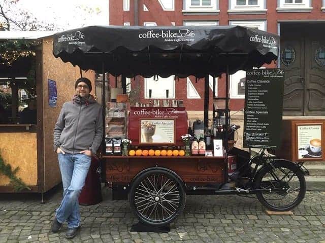 Jan Sander e Tobias Zimmer hanno avuto l’idea nel 2010, durante un viaggio in Danimarca. Appena usciti dall’università si sono messi all’opera e sono riusciti a creare un franchising di bike café non solo in terra teutonica, ma anche in molte città europee. Al momento sono circa 50 le Coffee-bike attive in Germania, Austria, Svizzera, Olanda, Francia, Repubblica Ceca. E sono arrivate pure in Kuwait e a Dubai. Per produrre una bicicletta-bar ci vogliono dalle quattro alle sei settimane. Oltre al caffè offrono spremute d’arancia, bagel, panini e prodotti di pasticceria. http://test.coffee-bike.com/en
