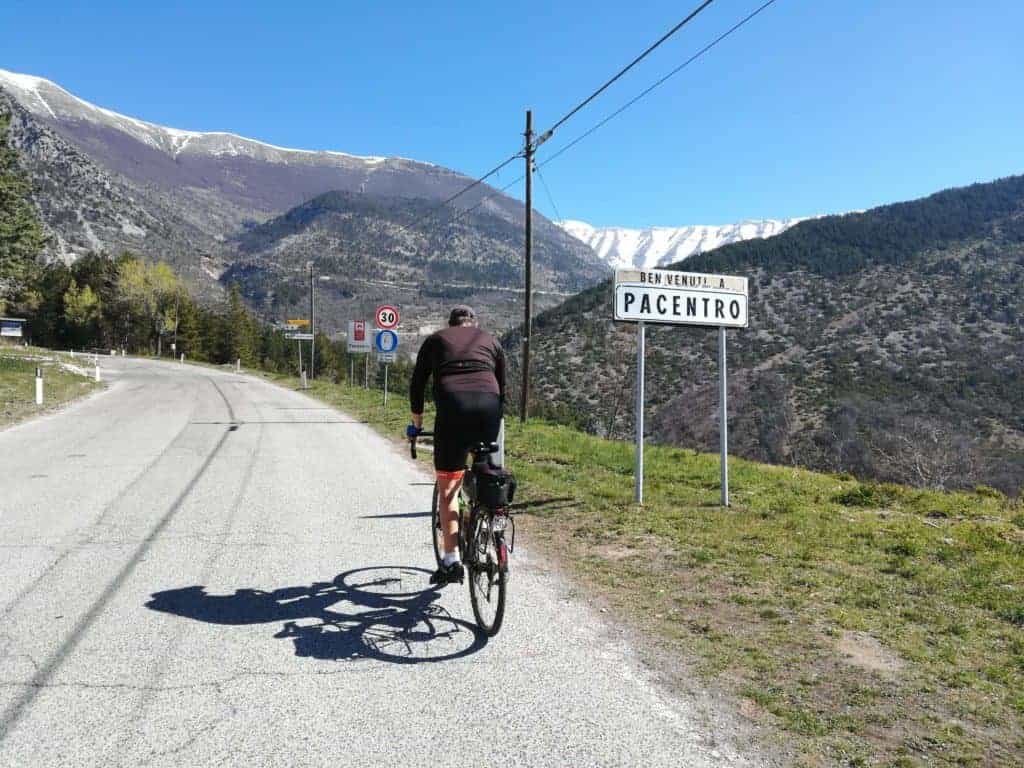 Lasciata Sulmona, attraversiamo la trafficata Statale 17 per fare ancora qualche chilometro in pianura. Di lì a poco inizia la scalata per il bellissimo borgo di Pacentro, a quota 690 metri. La salita è ancora graduale e moderata, e le forme innevate del massiccio della Majella si fanno sempre più vicine. L’aria è frizzante e respirabile, la strada sgombra e solo qualche auto sporadica ci sorpassa. Pacentro può essere ritenuto uno dei centri geografici della Majella, un paesino di poche anime e antichissime tradizioni gelosamente conservate. Castello medievale, campanili in pietra viva e vicoli sassosi scandiscono una prima sosta senz’altro dovuta, se non altro per riempire le borracce e fare quattro chiacchiere con gli anziani in piazza. Ma la salita è appena iniziata.