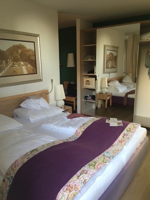 Dopo questo esordio felice, la camera non delude: tutta sui toni verde e rosa – lilla che pare un’ortensia, con tanto di salottino e giardinetto privato, un vero nido romantico. Che dire del ristorante, fatto di salette e salottini deliziosi, sempre sullo stesso tema cromatico “ortensia”, pavimento in beola e mobili tipici, con  i tavoli all’aperto a bordo piscina?  Impeccabile, come la cena di benvenuto che ci viene servita proprio lì: insalata con formaggio di capra caldo, una zuppa di crescione con ravioli ripieni di trota salmonata e un luccio perca assolutamente delizioso.