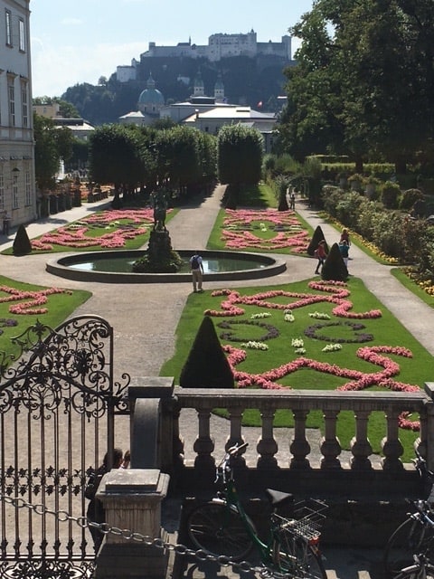 Riprendiamo le bici, e torniamo sui nostri passi, anzi, sui nostri pedali, godendoci un altro punto di vista sulla stessa bellissima strada, per dirigerci,  sempre su percorsi meravigliosamente ciclabili verso I giardini del castello di Mirabell, fatto costruire dal Vescovo Principe Wolf Dietrich von Raitenau, molto più dedito all’arte che alla fede e molto mal visto dalla chiesa, per la sua amante Salomè von Alt dalla quale ebbe 15 figli. Il castello, dai cui giardini si gode una vista perfetta sulla fortezza, è situato appena fuori Salisburgo.
