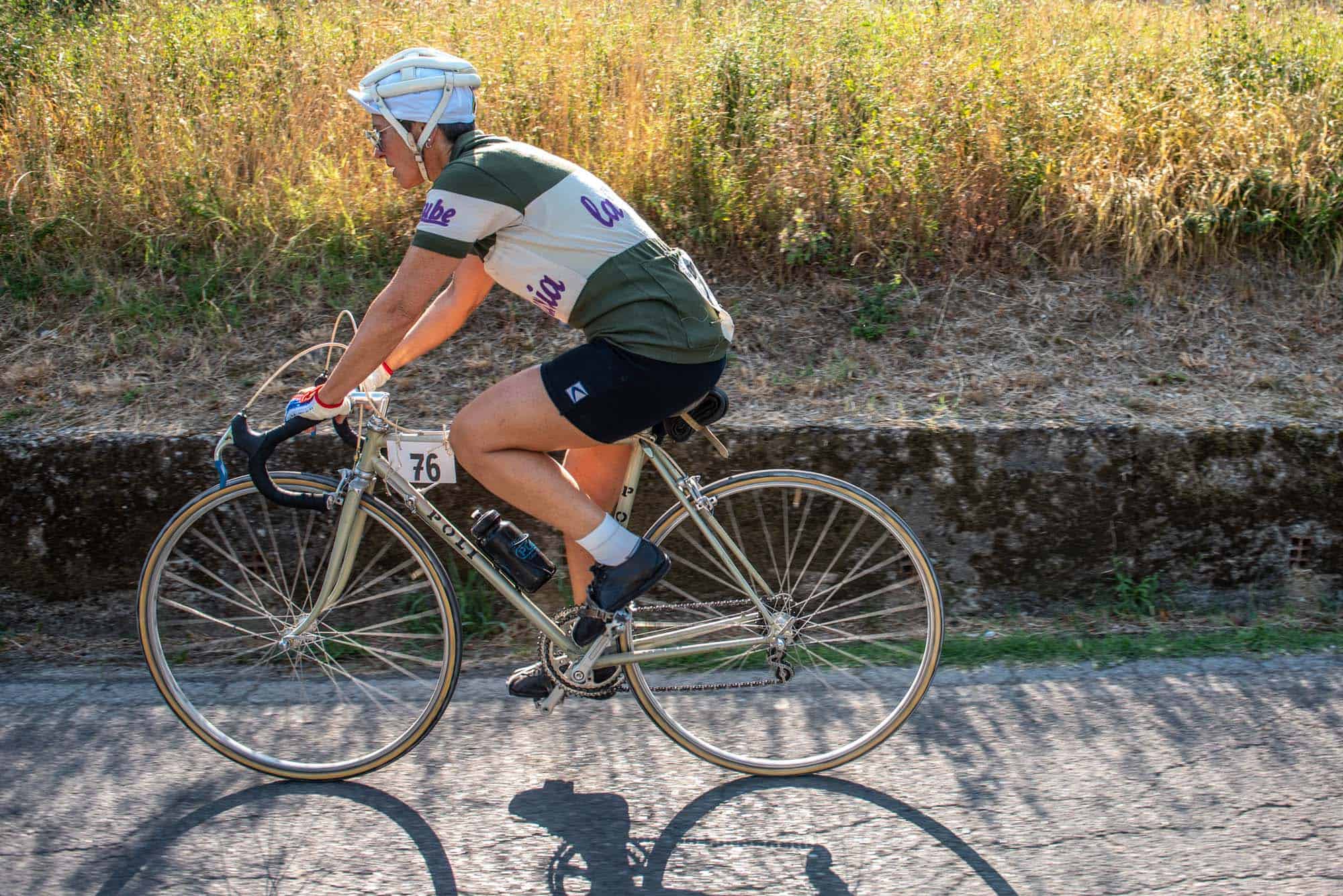 Personaggi noti, e meno noti, icone del ciclismo, giovani e giovani dentro, bambini, e tutti noi che domani, in sella alle biciclette dei nostri nonni, torneremo bambini. Con la maglia di lana cotta che punge, il cappellino con la visiera in su, i freni che tagliano le mani. E ci ricorderemo da dove viene il detto “far mangiare la polvere”. Ma per ora siamo qui, tutti insieme a ridere e scherzare, accompagnati dalla bellissima musica del gruppo “The Fettuccinis” che fa swing anni 50. Ci sono Moser e Cipollini, e c’è la signora Rosa che fa la porchetta arrosto dal 63, e per tantissimi anni ha seguito il Giro d’Italia coi suoi irresistibili panini, mentre oggi gestisce il Chiosco della porchetta Lammarese a Capannori, ed esibisce con l’orgoglio di una madre una porchetta lunga un metro e mezzo. C’è il sindaco di Capannori, ciclista che domani pedalerà con noi, e tanta gente del posto.
