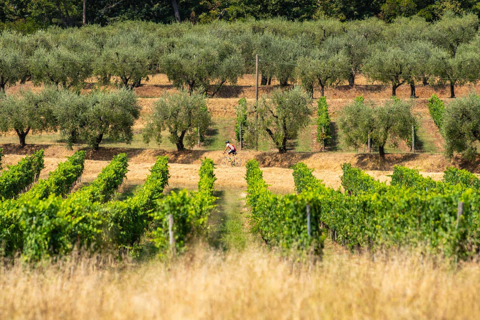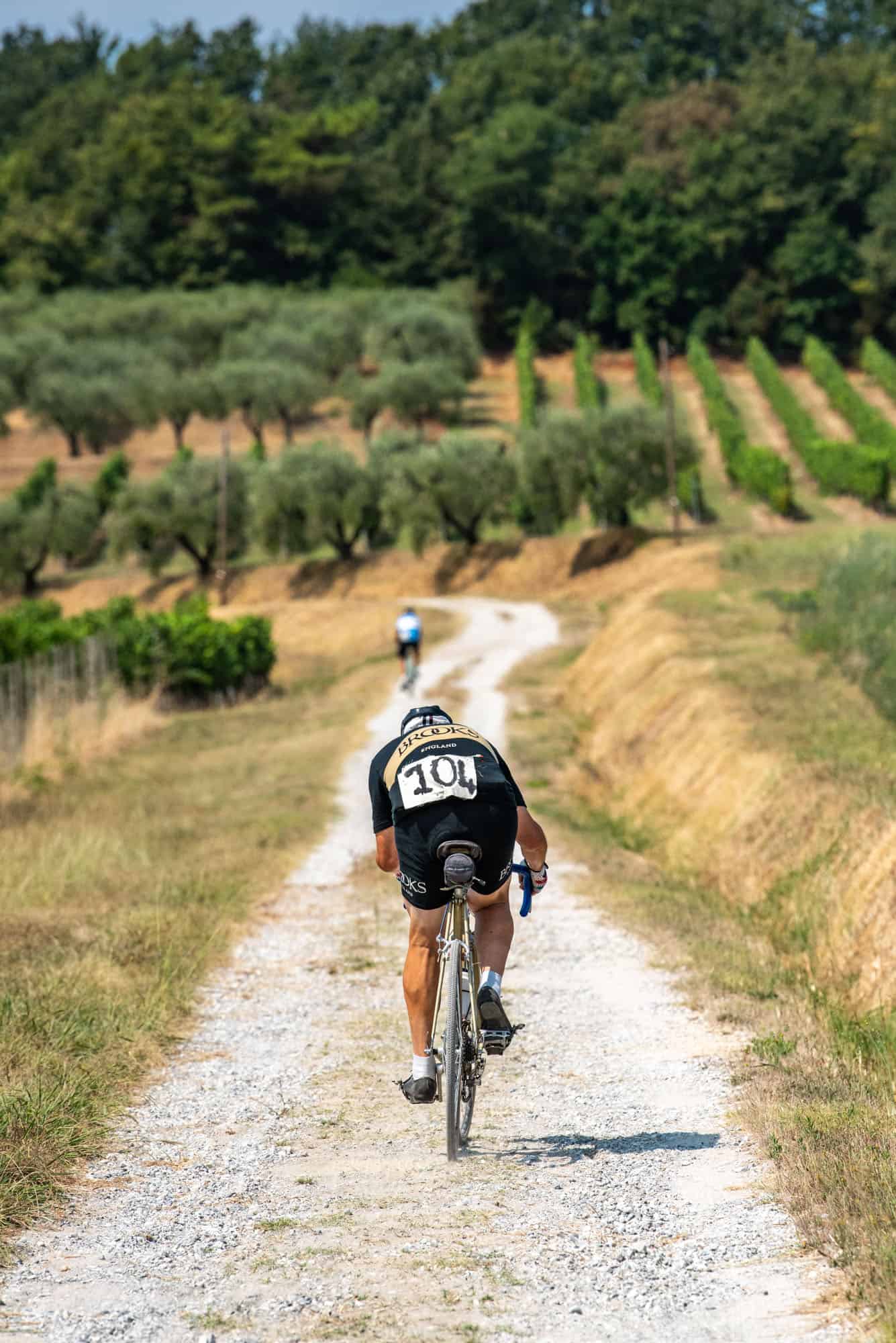 Da lì in poi è fatica. Tutta salita, dura come i rapporti che montiamo, e discesa, che su quelle bici lì è quasi peggio – ferro nelle dita, occhi che tremano – i tratti sterrati sono pietraie, rotte come le ossa in caso di caduta, ma nessuno cade. E si passano boschi di castagni ombrosi e freschi e vette esposte, e si attraversano con nonchalance i parchi delle Ville che ci aprono i loro cancelli antichi, come fossimo ospiti arrivati lì per una merenda sul prato. Che in un caso è proprio vero, perché il primo ristoro è nel parco de La Badiola, ed è la dimostrazione che il Covid, i distanziamenti, le precauzioni, nulla possono al cospetto della passione e dello spirito che anima queste manifestazioni. Il primo ristoro infatti è un “vero ristoro” come si usa da queste parti. C’è la musica, ovviamente – se no che festa sarebbe! – con la banda di Segromigno Monte, ci sono le torte, i crostini e quei meravigliosi panini alle acciughe marinate di Cristina Castiglioni maritata Carube che ci sognavamo tutti dal lontanissimo 2019. E immancabile, assaporiamo anche il buonissimo vino de La Badiola. Il vino in realtà è ovunque, è il tema dominante (si chiama La Vinaria, d’altra parte…), ci circonda nel paesaggio fatto di vigneti, e dentro a bottiglie e bicchieri, sempre a portata di mano.