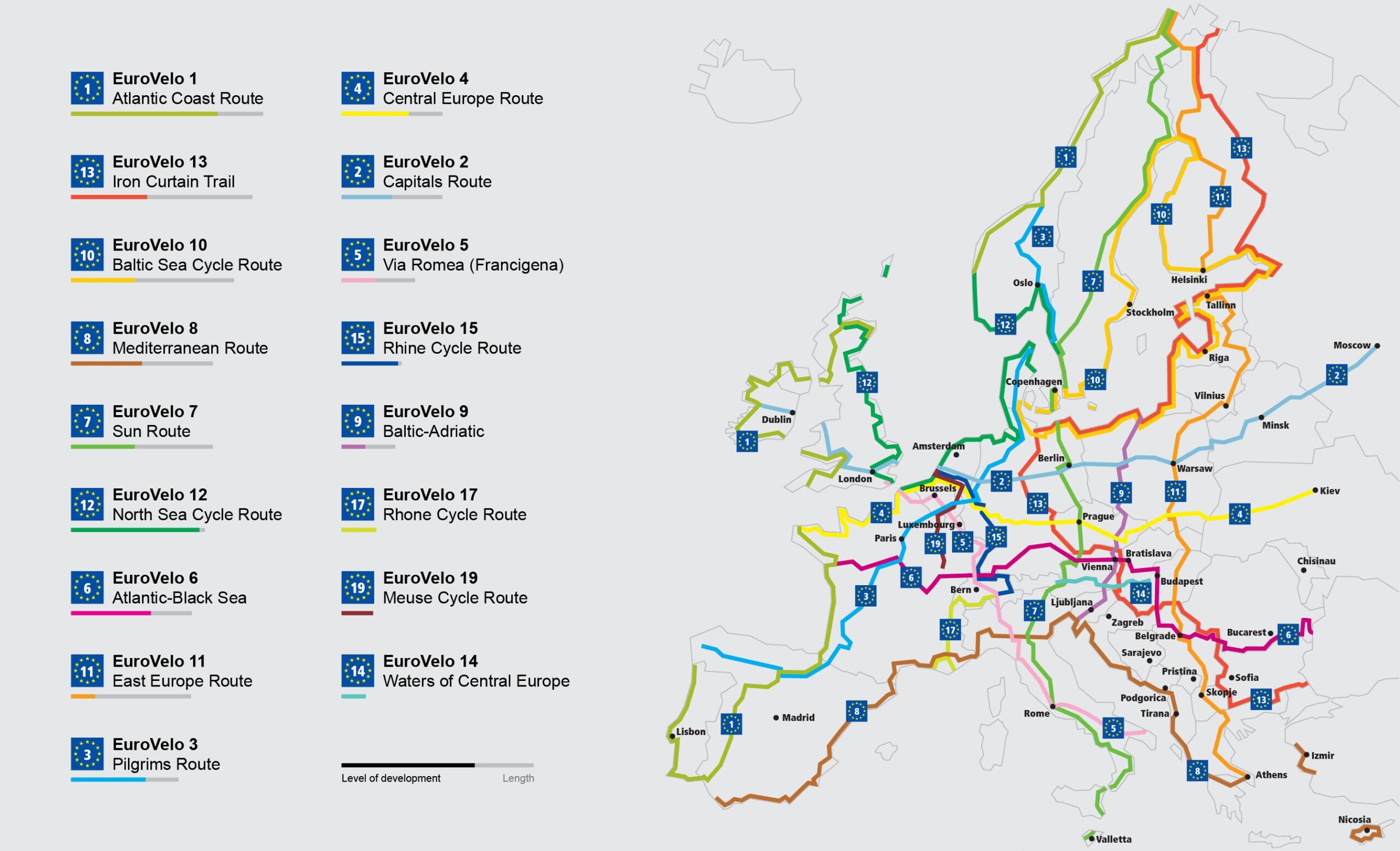 Eurovelo 1 – la costa dell’Atlantico; Eurovelo 2 – il percorso delle capitali; Eurovelo 3 – la via dei pellegrini; Eurovelo 4 – il percorso dell’Europa Centrale; Eurovelo 5 – via Romea Francigena; Eurovelo 6 – dall’Atlantico al Mar Nero; Eurovelo 7 – il percorso del sole; Eurovelo 8 – l’itinerario del Mediterraneo; Eurovelo 9 – dal Baltico all’Adriatico; Eurovelo 10 – il giro del Mar Baltico; Eurovelo 11 – il percorso dell’Europa orientale; Eurovelo 12 – il percorso del mare del Nord; Eurovelo 13 – il percorso della Cortina di Ferro; Eurovelo 14 – acque dell’Europa centrale; Eurovelo 15 – la pista ciclabile del Reno; Eurovelo 17 – la ciclovia del fiume Rodano; Eurovelo 19 – pista ciclabile della Mosa.