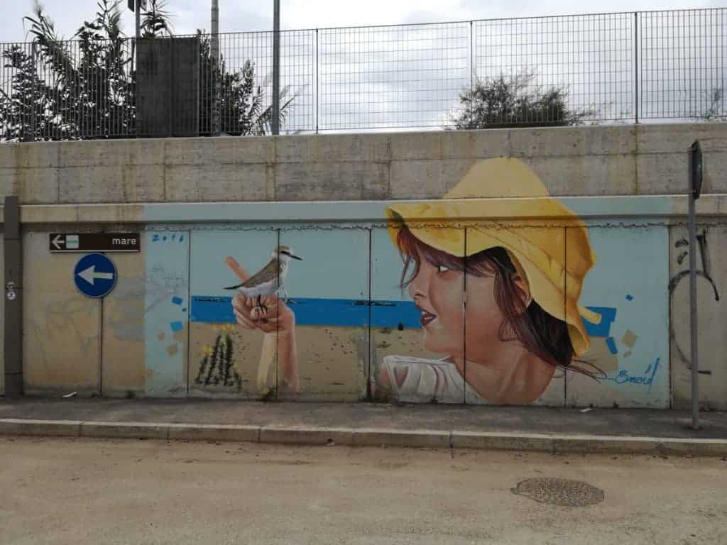 La nostra pedalata prosegue tranquilla, cullati dall’odore di fritto di qualche bar sporadico e il profumo dei filari di uva matura. Qua e là, murales e opere di street art abbelliscono il grigiore anonimo dei cavalcavia in cemento. Passiamo così anche Francavilla, e ci prepariamo ad affrontare i saliscendi costieri in vista di Ortona la bella.
