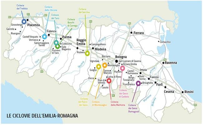 L’Italia ha varato progetti inerenti quattro ciclovie turistiche nazionali che in parte si interconnettono con tracciati europei (Eurovelo), due di queste ciclovie attraversano anche l’Emilia Romagna: Vento e la Ciclovia del Sole.