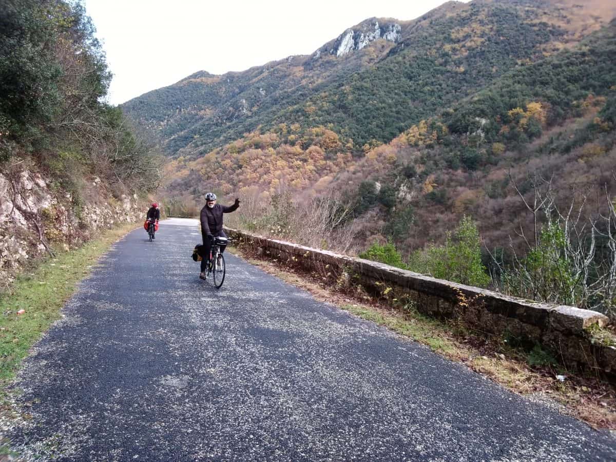 Ci troviamo ora ai confini della Val di Comino, nei pressi di Atina. Ancora un chilometro di lieve salita verso Casalvieri, e ci ritroviamo in un luogo surreale, le Gole del Melfa. Ad oggi questo stretto passaggio roccioso scavato con pazienza dall’acqua nei secoli consta di una strada chiusa al traffico a causa di recenti frane. Per questa ragione, oggi abbiamo la possibilità di percorrere una quindicina di chilometri in leggerissima discesa, senza incontrare neanche un’automobile, cullati dallo spettacolo del Melfa che si dipana in fondo a un canyon monumentale. Nel complesso, si tratta di una delle strade più belle mai fatte in Italia, dal punto di vista cicloturistico.