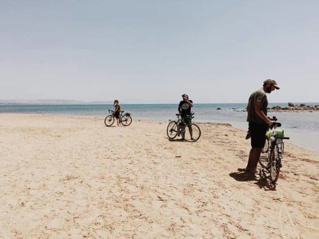 Ci viene in soccorso Lorenzo Sabella, titolare di 100% bici a Sciacca, che ci carica tutti e cinque col furgone sottraendoci dal pessimo traffico della statale. Per entrare tutti nel mezzo, le due fanciulle si siedono davanti accanto a lui, mentre io, Giuseppe e Giancarlo ci accucciamo nel fondo del furgone insieme alle bici: la scena di carico è da caporalato, il sudore delle braccia a contatto tra loro unite alle espressioni sconvolte e alle scosse da furgone ci danno l’aspetto di braccianti portati da un latifondo all’altro. E invece stiamo soltanto facendo un tranquillo viaggio in bicicletta, mentre questa è la realtà – non scelta, ma imposta – di tanti in queste zone.