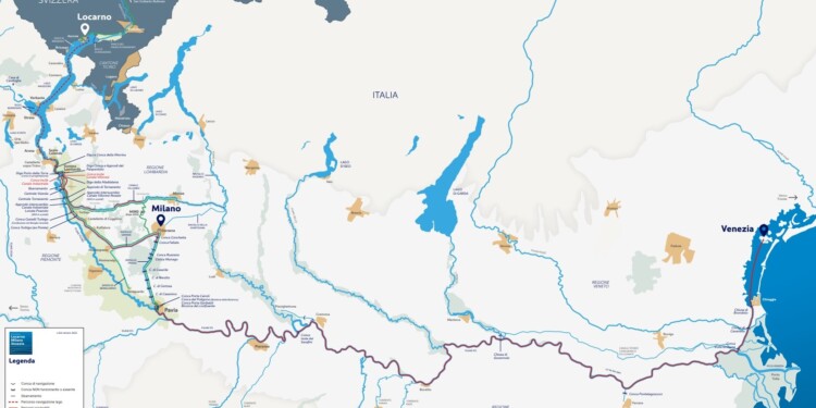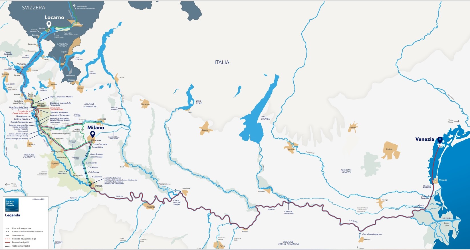 Dalla svizzera Locarno il percorso scende attraverso il Lago Maggiore fino ad Arona e Sesto Calende, per poi proseguire sul fiume Ticino, attraverso la conca della Diga della Miorina fino alla diga di Porto della Torre. Il fiume Ticino prosegue poi per 900m fino alla diga ottocentesca del Panperduto nel comune di Somma Lombardo. Qui si formano due canali e attraverso il canale Villoresi prima e il Naviglio Grande poi si raggiunge la Darsena di Milano. Su tutto il percorso da Sesto Calende a Milano, lungo i canali sono presenti percorsi ciclabili e pedonali che poi proseguono fino a Pavia lungo il Canale pavese. Dalla Darsena di Porta Ticinese a Milano imboccando via Alzaia Naviglio Pavese, seguendo le acque del fiume per 30 km, si arriva alla Certosa di Pavia e con altri 6 km al centro storico di Pavia. Da Pavia passando per Cremona si arriva fino a Venezia.