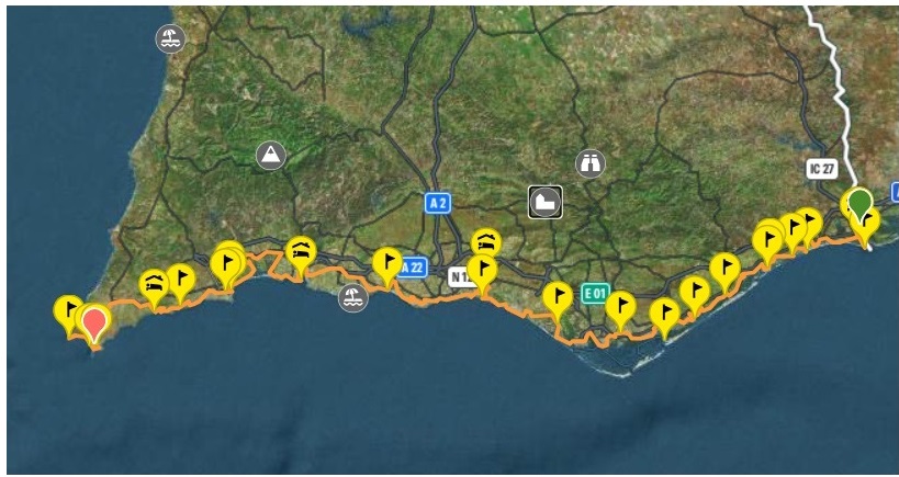 Dall’estuario del fiume Guadiana continua verso ovest fino a trovare Cabo de São Vicente, fino a Caminha, all’estuario del fiume Miño. Si seguono gli itinerari come Ecovia del Litoral, Rota Vicentina e Caminho de Santiago lungo la costa. Da non perdere Fortaleza de Segre, il punto più a sud ovest del continente europeo, il Parque Natural di Ria Formosa e la Cattedrale di Sé costruita su un’antica moschea a Faro.
