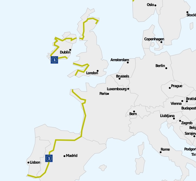 Il percorso è principalmente costiero tra sentieri e strade, molti dei quali costeggiano o coincidono con la Wild Atlantic Way (WAW) e passa vicino ai centri di Galway, Limerick e Cork, e ancora Letterkenny, Sligo, Tralee. Sono tranquille strade rurali e greenways, tra cui la Waterford Greenway, la Limerick Greenway e la Great Western Greenway. A Belfast si può prendere il traghetto per attraversare il Mare d’Irlanda.