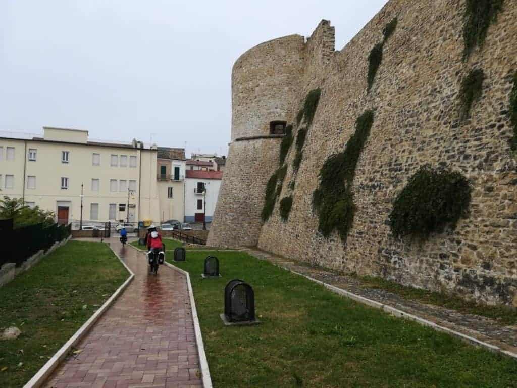 Partendo dal Castello Aragonese, attraversiamo il centro di Ortona per spingerci verso l’interno. Dopo qualche corsia ciclabile e rotatoria, il paesaggio dell’entroterra abruzzese ci dà subito il benvenuto con i primi dislivelli. Lievi all’inizio, più nervosi poi. Attraversiamo così vigneti e campagne fino a Orsogna, piccolo borgo semidistrutto dalle azioni belliche del 1943. Il suo nome curioso deriva dall’antica forma dialettale Orsonia, probabilmente originato dalla frequente presenza di orsi della vicina Majella. E proprio la Majella, con le sue forme morbide e quasi sempre innevate, dominerà l’orizzonte di questa prima tappa.