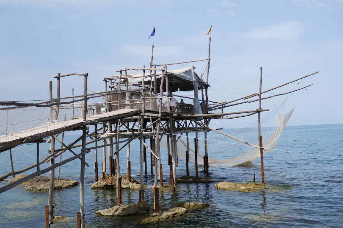 Un’antica macchina da pesca strutturata come una grande palafitta protesa sul mare e ancorata al suolo attraverso grossi pali di robinia incassati sugli scogli, si spinge a sfidare il mare anche fino a cinquanta metri dalla riva e svetta dal pelo dell’acqua fino a sei metri: gli antichi abitatori d’Abruzzo – che più che pescatori erano contadini e uomini di terra – utilizzavano questa costruzione per pescare, ma farlo senza imbattersi in mare e navigare, con tutti i rischi che questo poteva comportare.