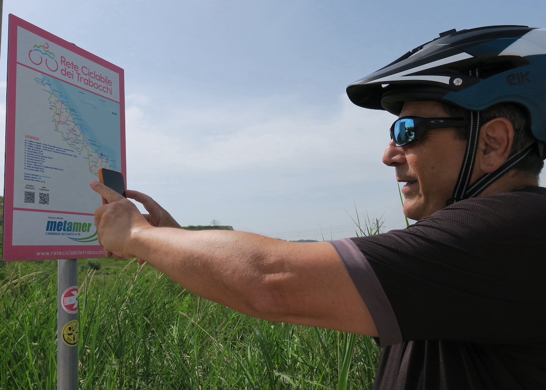 A scortarci per questa nostra prima tranquilla pedalata sulla ciclopedonale che da Ortona conduce verso sud è Luciana: ci ricorda che oltre alle guide e alla puntuale segnaletica permanente, tutti gli itinerari della rete Ciclabile dei Trabocchi sono fruibili con dispositivi gps, sono salvati sulla piattaforma di geonavigazione Komoot e sono tutti identificabili (anche) attraverso la lettura del QR code collegato ad ognuno dei dieci ciclopercorsi della Rete.