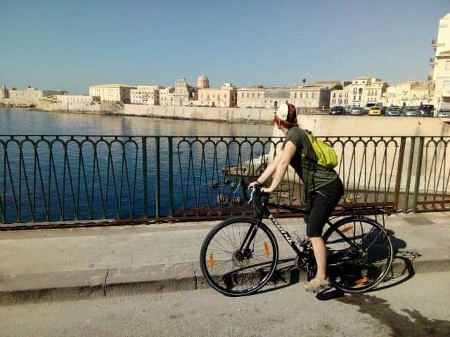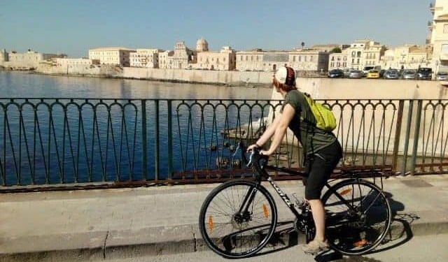 Il dramma interiore è trovare una giusta bilancia tra ciclismo e turismo, specie ora che tanta bellezza si concentra in pochi chilometri. Correre e seguire la strada, o rimanere alla ricerca di quel borgo o quel forno? Fermarsi e vedere anche un minimo sindacale città come Noto o Ragusa richiede delle tappe molto più brevi delle nostre, che seguono una tabella di marcia serrata, ma sarebbe davvero un crimine fare tanta fatica per passare dentro Siracusa di sera e ripartire all’alba del giorno dopo. E così decidiamo di concedere le prime ore della mattinata alla più bella e fiorente colonia greca, la città di Archimede, nata da un’insenatura dietro un’isola che la rendevano un porto naturale e inattaccabile, cresciuta tra il mare e una valle ricca d’ogni genere di frutti, che oggi conserva il suo fascino intatto. Qui il tiranno Dionisio tenne prigioniero Platone, qui nacquero innumerevoli miti e leggende greche, prima tra tutte quella della ninfa Aretusa.