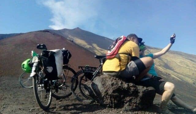 Divorare in pochi secondi quei metri conquistati tanto faticosamente ti dà un’idea dell’energia potenziale accumulata. E del fatto che tutto è relativo. La lunghezza della discesa riscalda i cerchi e fonde le camere d’aria: Piero fora due volte per questo motivo e solo a fatica riusciamo a guadagnare il nostro campo base, comprando altre camere d’aria a Giarre e ritornando nel buio alle tende. L’impresa di oggi va celebrata, e una cenetta a base di pesce e vino bianco a bordo mare è doverosa. Gli effetti sono devastanti: la stanchezza avvolge tutti, e questa terza e ultima notte ci sorprende in uno stato pietoso. Piero si addormenta in tenda da seduto, coi panni da lavare ancora in mano.
