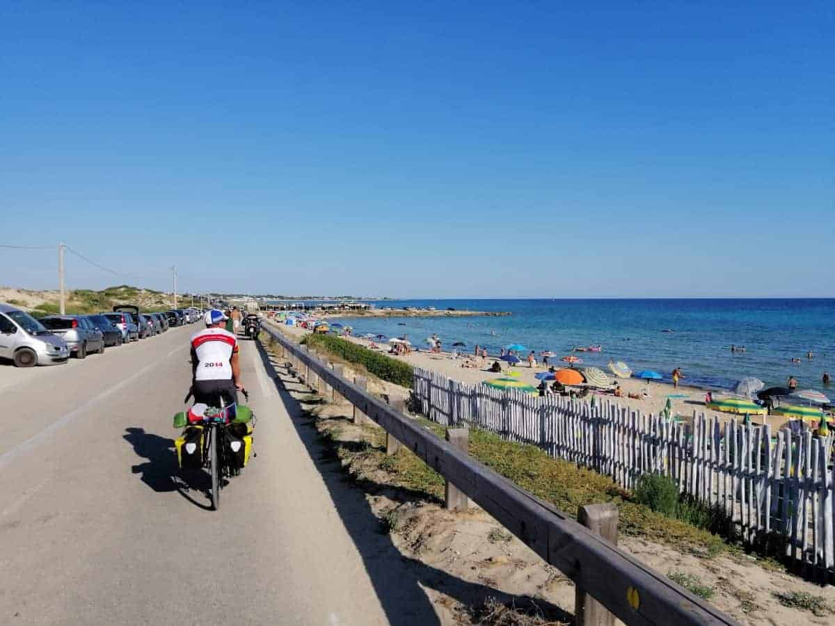 L’ultimo tratto regala infine un piacevole tratto al fresco degli ulivi, signori incontrastati di queste terre: stiamo parlando della Riserva naturale Le Cesine, dove si può godere di una decina di km senza auto su strade asfaltate chiuse al traffico. Qualche colpo di pedale ancora e siamo a San Cataldo, spiaggia della movida amata dalla gioventù leccese. Ovviamente, un tour del Salento non può che terminare con la visita al suo capoluogo. Purtroppo per arrivarci la strada non è il massimo. Purtroppo la pista ciclabile che scorre accanto alla pericolosa SP364 è discontinua e malmessa, e per seguirla occorre un po’ di costanza.