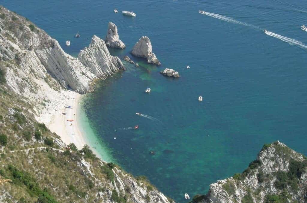 Passiamo nel centro di Marcelli e poco dopo iniziamo la salita che ci porterà, prima a Numana, col suo famoso Arco a strapiombo sul porto e successivamente a Sirolo con la sua splendida piazzetta. Da qui in poi inizia la parte più dura, ma anche più affascinante del percorso. Immersi tra gli alberi, col profumo della natura che non ti lascia mai, saliamo verso il sentiero del Passo del Lupo da dove si possono ammirare le 2 Sorelle, famosa spiaggia. In questo momento stiamo pedalando su una cresta dove da una parte abbiamo la vista delle 2 Sorelle mentre dall’altra tutto il litorale appena passato. Ancora su, fino a raggiungere il belvedere, punto più alto da dove finalmente possiamo ammirare in tutta la sua grandezza e bellezza la baia di Portonovo, quella di Mezzavalle, il Trave, e tutta la costa fino ad Ancona.