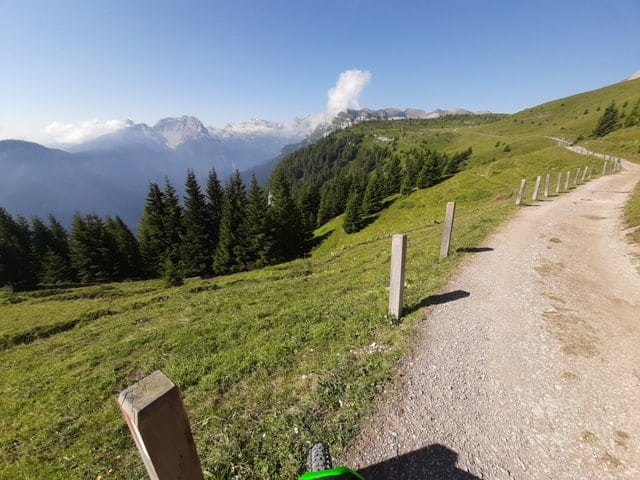 Partendo da Cles, il comune più importante della valle, siamo saliti in macchina fino al lago verde. Sono circa 16 km di strada asfaltata, che se volete potete percorrere con la vostra bicicletta. Noi per ragioni di tempo abbiamo preferito portarci velocemente dai 656 metri di Cles, ai 1.641 del lago. Qui lasciata la macchina al parcheggio, abbiamo imboccato la strada sterrata che sale verso il rifugio Peller. Le pendenze spesso diventano così importanti che alcuni tratti sono cementati per una maggiore sicurezza. In questi casi, il motore della bianchi t-tronik, ci aiuta a non dover scendere e saliamo con regolarità fino al bivio ai piedi del rifugio.