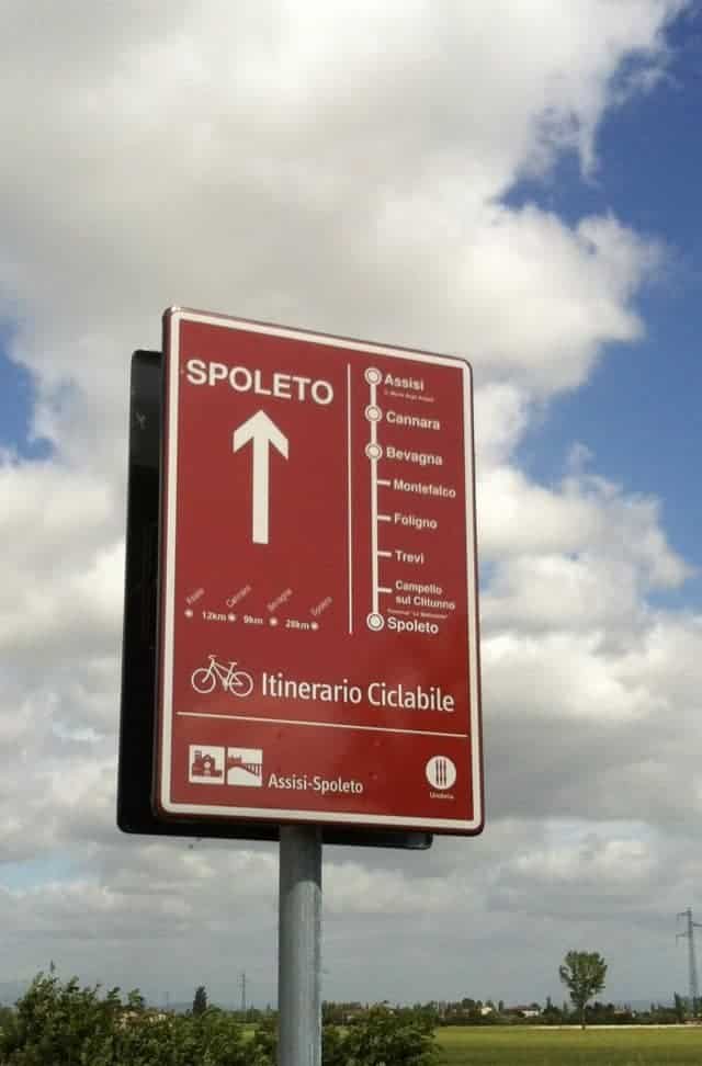 Noi abbiamo percorso l’itinerario da Assisi a Spoleto, ma si può pedalare indifferentemente in entrambe le direzioni, visto che il percorso è molto ben segnalato in tutti e due i sensi. Si tratta di un itinerario ciclabile molto interessante, perché scorre lontano dal traffico ed è quasi interamente pianeggiante, quindi adatto a tutti, anche ai meno allenati. ciclabile umbra viagginbiciIn più, in pochi chilometri, vi permetterà di attraversare città d’arte come Assisi, Bevagna e Spoleto, ma anche sfiorare altri borghi come Montefalco, Trevi e Passignano, che si possono visitare con brevi deviazioni. Tra un borgo e l’altro, poi, è tutto un pedalare nel verde della campagna umbra, tra campi coltivati, vigneti e uliveti.