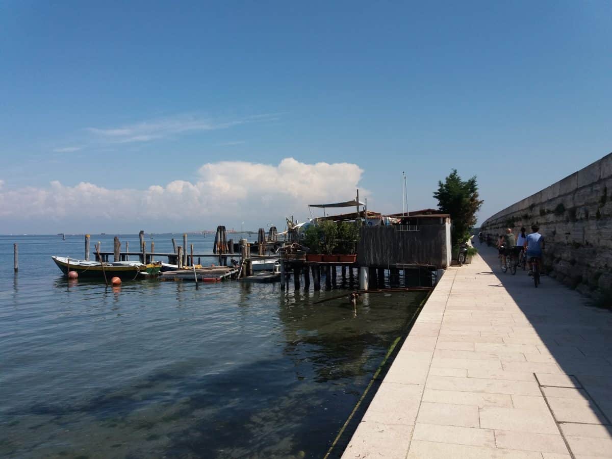 Poco prima delle 10.00 siamo approdati a Ca’ Roman, abbiamo inforcato le biciclette e abbiamo percorso i 2,5 km che la separano da Pellestrina percorrendo i famosi “Murazzi”, una fortificazione artificiale che protegge le isole e la laguna dalle mareggiate.
