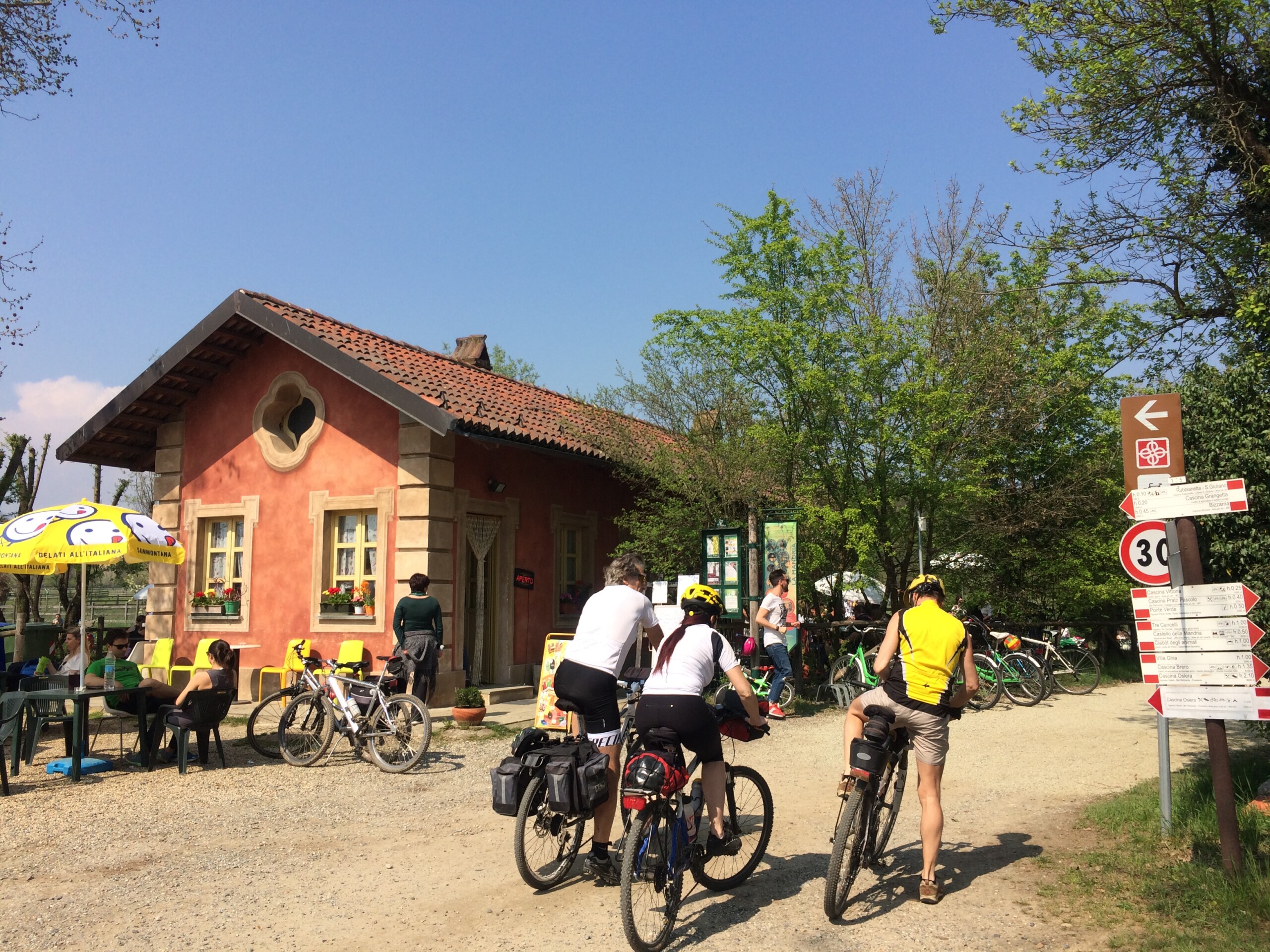 Entrando dall’ingresso “ponte verde” trovate a poche centinaia di metri uno dei tre punti di noleggio bike, gli altri due sono alla Cascina Oslera e Cascina Rampa. In quest’ultima potrete noleggiare anche le ebike, nel caso non foste allenati.
