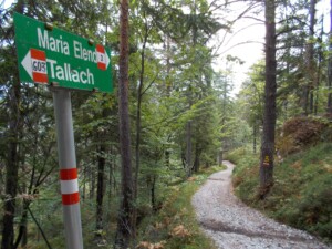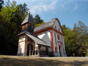 Prima di risalire in bicicletta, ci viene “svelata” la nostra destinazione, una delle chiese lungo la valle, dove avremo modo di controllare di persona cosa avviene quando le linee di incontrano. Risaliamo in bicicletta e ci avviciniamo alla base delle Caravanche, dove lasciamo le bici, per una breve salita a piedi, fino ad arrivare alla cappella di montagna di Maria Elend. Qui breve sosta alla fonte per bere e poi di nuovo con i “ferri” in mano per verificare, quando una persona si trova al centro della chiesa, che i ferri alternativamente si dispongano a 90 o a 180 gradi, come a significare che li si incrociano le linee…