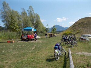 Riprendiamo la bicicletta e ritorniamo alla Drava, dove, qualche chilometro dopo, ci aspetta il campo allestito dall’albergo per il pranzo: una bella tavolata, all’ombra di una tenda con il classico tagliere di affettati e formaggi (il cui nome è jause).