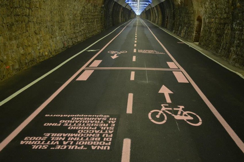Nella Riviera di Ponente si utilizza il tracciato della vecchia ferrovia per una pista ciclabile, una delizia che ci permette di scoprire alcuni scorci nascosti di quel territorio, che fino a quando era in funzione la linea ferroviaria erano inaccessibili. La pista percorre circa 24 chilometri e va da San Lorenzo al Mare fino a Sanremo ed è caratterizzata da passaggi suggestivi, che portano i visitatori a stretto contatto con il mare nella sottile striscia di terra che lo separa dalla sede della strada statale Aurelia.