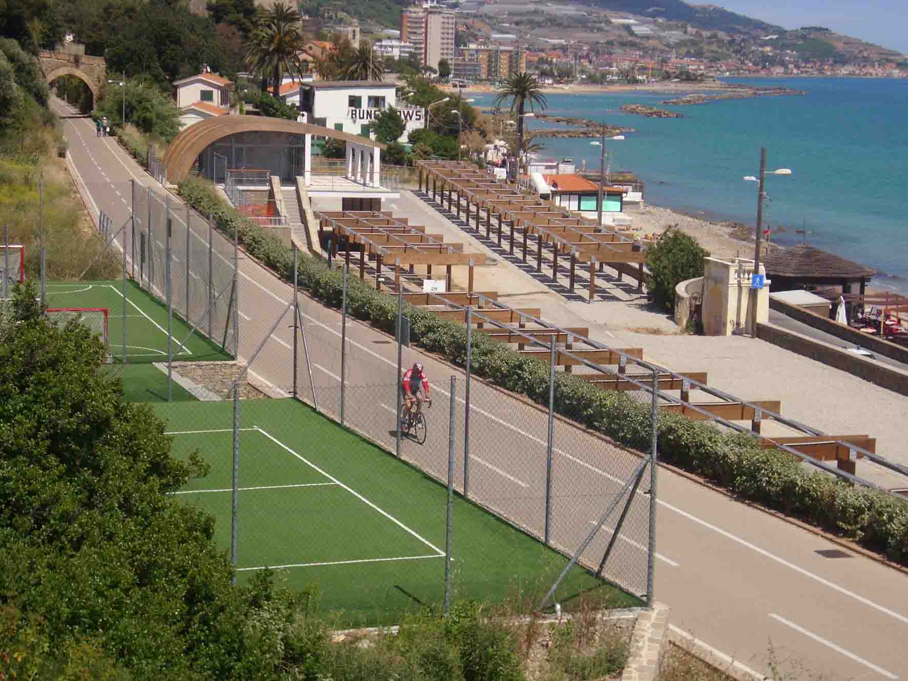 Correndo tra le case, la pista si allarga percorrendo poi l’area della vecchia stazione, e prosegue attraversando campagne coltivate, fino a raggiungere il Comune di Riva Ligure. Dalla pista è molto facile l’accesso a uno splendido lungomare e a diverse spiagge sabbiose attrezzate o libere, che invogliano ad un bagno rinfrescante.