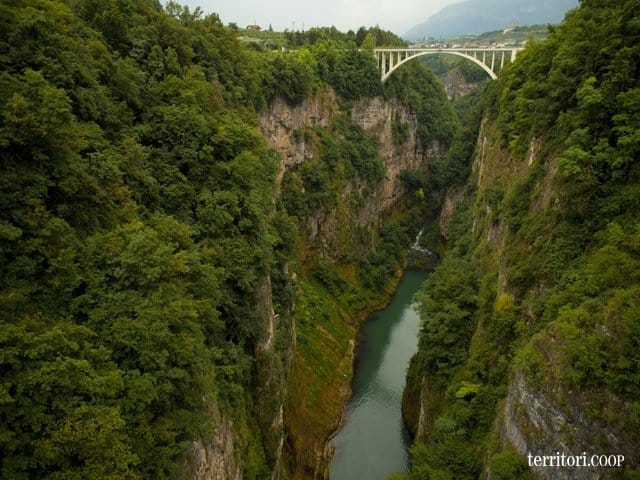 Il ponte scavalca una profonda gola, in corrispondenza del punto dove il torrente Noce si getta nel Lago di Santa Giustina, grande bacino chiuso da una altissima diga, posta circa 10 km più a valle.