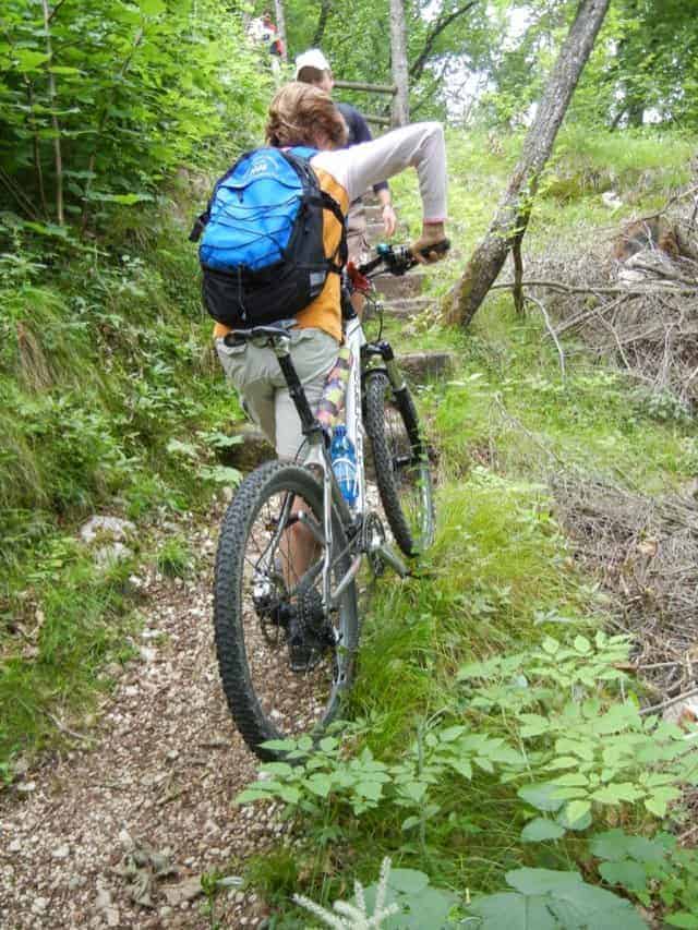 La strada comincia un po’ a salire e sulla destra si oltrepassa l’attacco del Sentiero degli Alpini che si sviluppa a ridosso delle rive del lago. Se siete muniti di MTB e avete voglia di portarvela per qualche decina di gradini in spalla, il sentiero degli alpini si ricollega più avanti con il nostro giro. La strada sale ora in maniera più decisa facendosi più panoramica, ma poco oltre inizia a scollinare e prosegue discostandosi un po’ dal lago per attraversare un tratto di bosco di faggi.