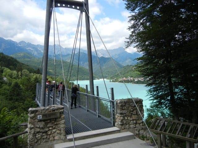 Appena partiti, sulla sinistra si supera l’imbocco del sentiero del Dint, percorso escursionistico pedonale che inizia a gradoni, e che in meno di 10 minuti a piedi porta ad una terrazza panoramica, da cui si domina l’intero lago e la diga, e che ha la parte finale sospesa con una pavimentazione in vetro, con l’effetto di camminare nel vuoto, molto suggestivo!