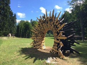 Avendo delle e-bike e potendo sfruttare più o meno l’aiuto del motore elettrico, la salita non è certo un problema. Quando la strada spiana leggermente mancano poche centinaia di metri all’inizio del percorso sterrato che conduce ad Arte Sella. Questi ultimi 3 km circa sono già un museo. Saremo accompagnati da varie opere d’arte, 25 in tutto e tutte rigorosamente in materiale naturale, che si inseriscono perfettamente nel bosco che stiamo attraversando.