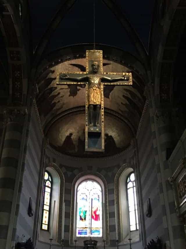 rende unico in Italia ed un crocefisso di epoca medioevale davanti all’altare. Uscendo, è ben visibile un altro importante simbolo della città, la Torre Civica dell’XI sec.