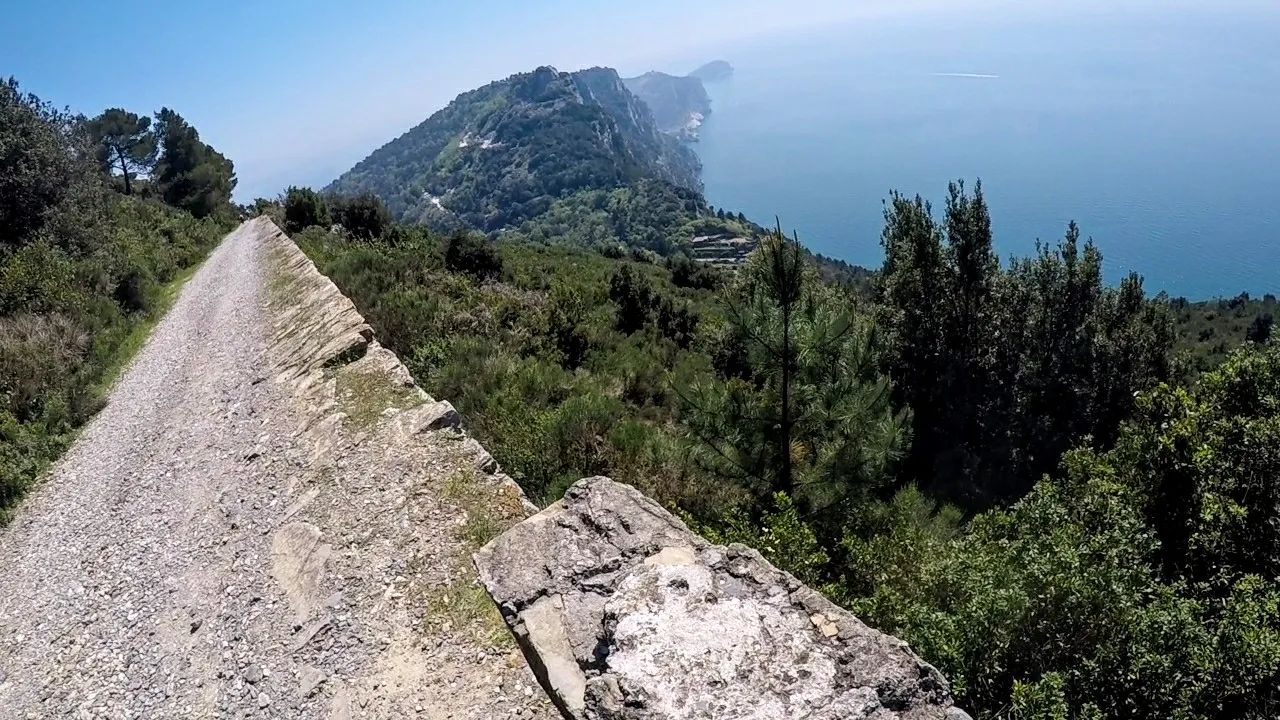 Il percorso continua in quota, tra saliscendi tecnici e tratti sterrati immersi nella macchia mediterranea. Il Colle del Telegrafo è uno dei punti più panoramici, dove lo sguardo abbraccia il Golfo dei Poeti. Il sentiero è condiviso con escursionisti, quindi è importante mantenere attenzione e rispetto. Qui, il silenzio è interrotto solo dal fruscio delle ruote sul sentiero e dal canto degli uccelli.