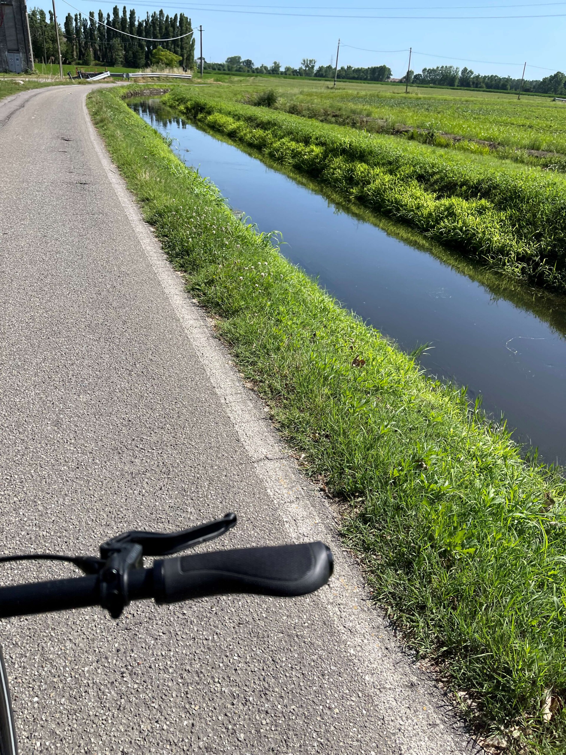 Si incontra poi il Lambro, che in passato aveva un corso diverso dall’attuale. Il “taglio” del 1180 ne spostò la foce, ma l’antico alveo rimase importante per i collegamenti tra Milano e il Po. Qui si trovava il “porto” milanese, collegato a Milano tramite il Lambro e la Vettabbia.Il percorso costeggia il Po, offrendo panorami ampi e luminosi. Il fiume, maestoso e placido, riflette il cielo e le nuvole, mentre le rive sono un susseguirsi di canneti, pioppeti e spiagge di ghiaia.Si incontrano cascine isolate, testimoni di un’economia agricola secolare. I cortili silenziosi e le stalle vuote raccontano di un passato rurale, ma i trattori ricordano che la campagna è ancora viva.