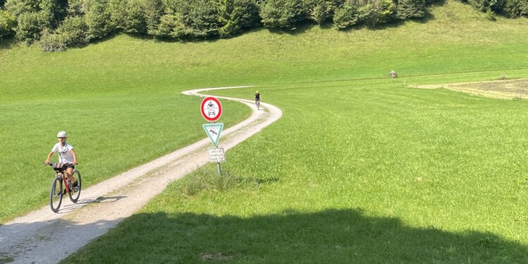 Oggi ci aspetta un po’ di dislivello: lo sappiamo, ma saperlo non basta. La prima parte del percorso è molto bella: alla ciclabile si alternano tratti sterrati. Uno di questi ci porta alla Peter’s Radlwetter, un punto di ristoro con ogni ben di Dio: biscotti fragranti, frutta, barrette, caramelle, acqua e persino materiale per la manutenzione della bici. Un’oasi di bellezza e amore, con una cassettina per lasciare una donazione libera. Nessuna telecamera, tutto si basa su fiducia e rispetto. È un luogo che ci ricarica, di una dolcezza disarmante: vorremmo incontrare Peter o chi per lui per abbracciarlo, ma troviamo solo altri cicloviaggiatori, sbalorditi come noi.