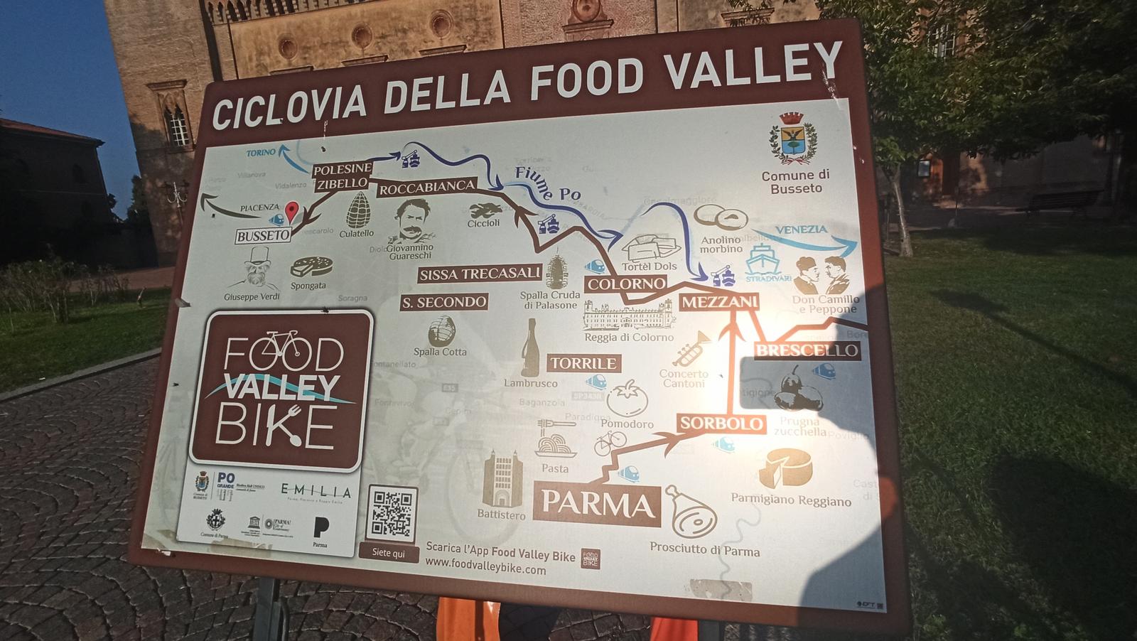 La parte del tracciato che va da Parma a Colorno ed è lungo circa 43 km, e attraversa il territorio del Parmigiano Reggiano, degli anolini, della prugna zucchella di Lentigione, del pomodoro di Sorbolo. Questa prima parte della ciclabile della Food Valley Bike è a sua volta suddivisa in quattro tratte che vengono distinte in Ciclabile della Pastasciutta (da Parma a Sorbolo, circa 18 km), la Ciclabile della prugna Zucchella (da Sorbolo a Coenzo, circa 8 km) e la Ciclabile dell’Anolino (da Sorbolo a Mezzani sul Po, circa 14 km) e la Ciclabile del Tortel Dòls (circa 11 km fino a Colorno). Dopo circa 40 km dalla partenza di Parma, si arriva a Colorno, noto per la bellissima Reggia, conosciuta come la piccola Versailles della Bassa.