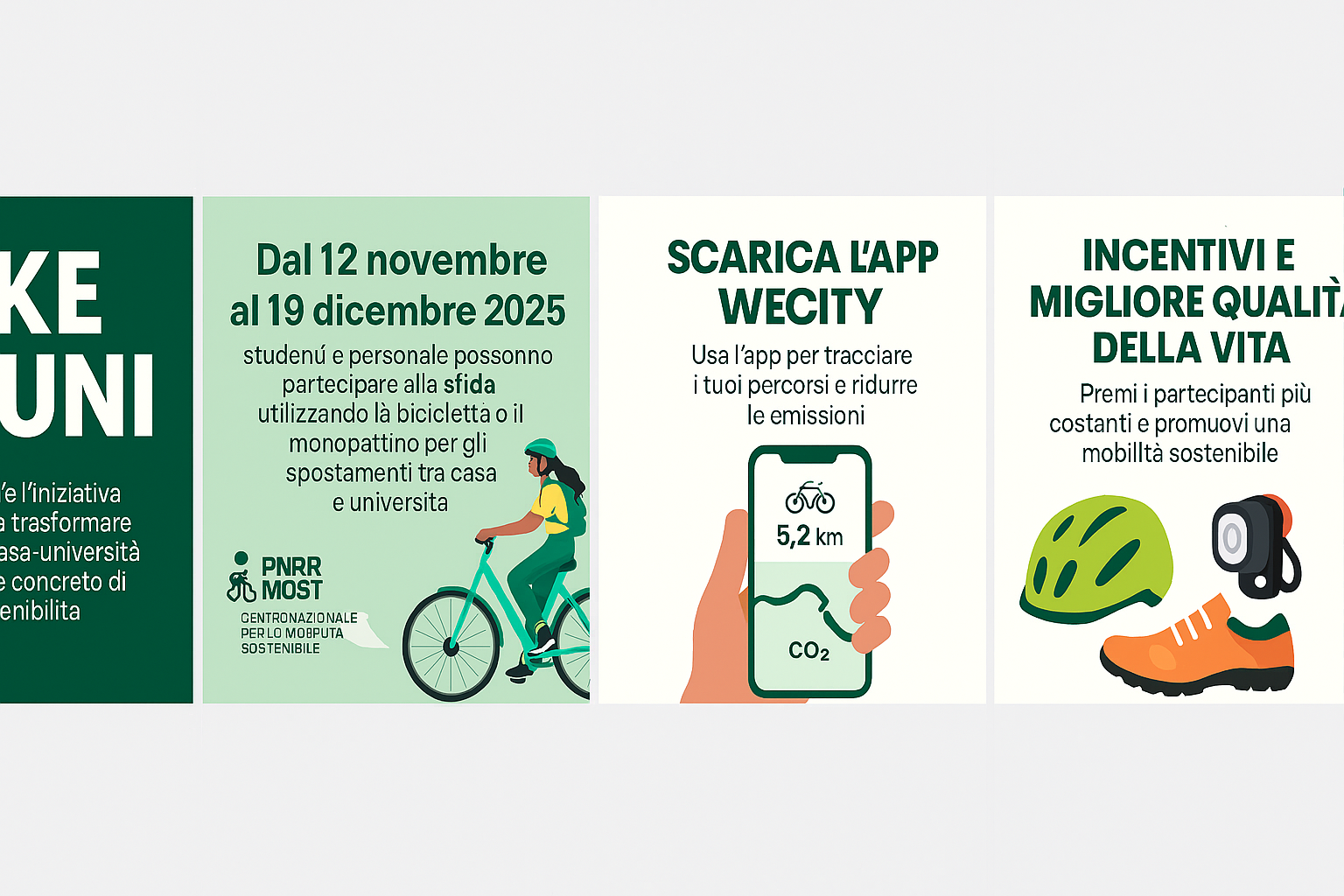 Il funzionamento è semplice: basta scaricare l’app Wecity, inserire il codice dell’iniziativa e attivare il tracciamento dei percorsi. Ogni chilometro senza emissioni diventa un dato utile per monitorare il risparmio di CO₂ e scalare la classifica in tempo reale. I più costanti saranno premiati con accessori per la bici: caschi, copriscarpe e set di luci, consegnati durante un evento finale nei campus.