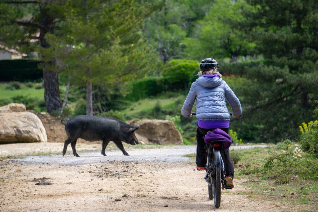 Un percorso che ci ha riservato anche incontri molto simpatici, come la numerosissima famigliola di maiali neri che tentano di salire sulle vostre bici lasciate un attimo incustodite. La sosta successiva e’ per ammirare un lago alpino, acque fermissime incorniciate da ciliegi e prati. Foto di rito tutti e quattro e poi via attraverso un Golu .